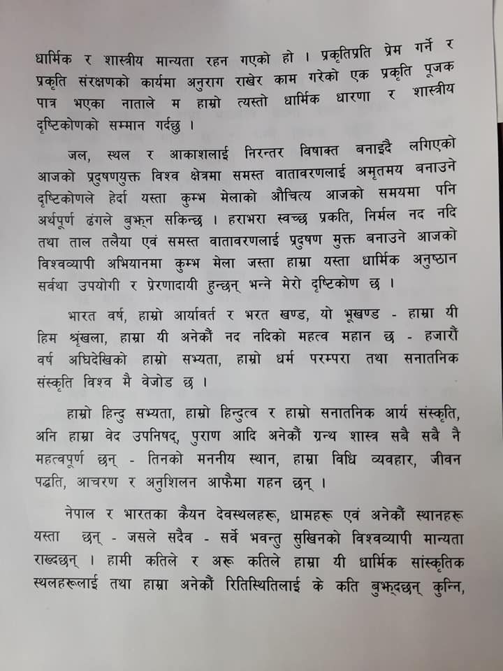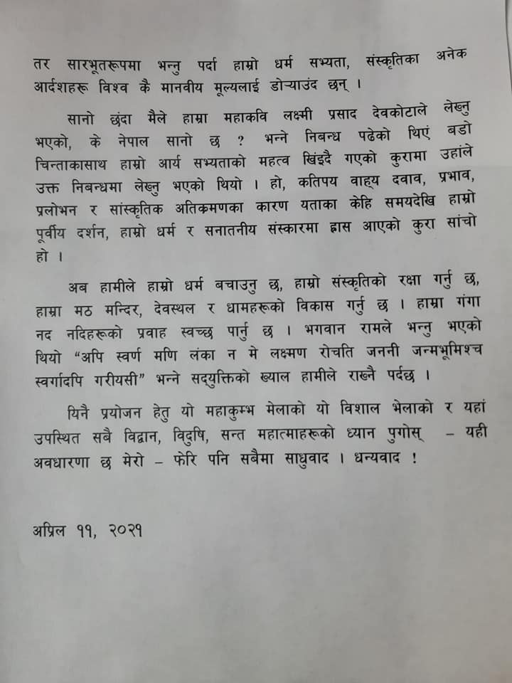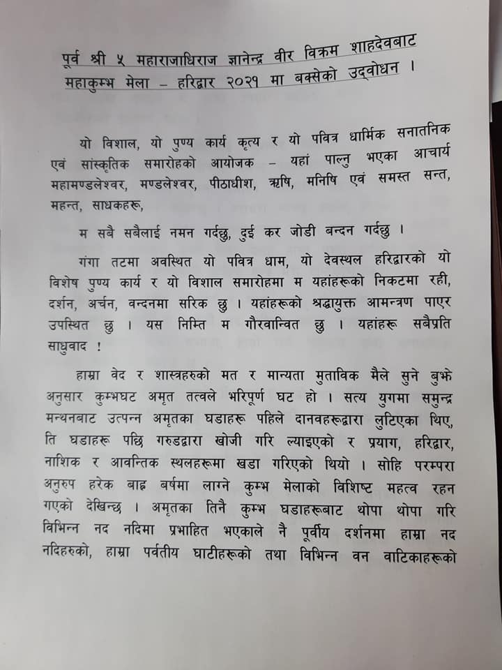 ‘हामीले हाम्रो धर्म बचाउनु छ, हाम्रो संस्कृतिको रक्षा गर्नु छ,’ भारतको हरिद्वारमा आयोजित कुम्भमेलामा आज सम्बोधन गर्दै भने,‘हाम्रो धर्म र सनातनीय संस्कारमा ह्रास आएको कुरा साँचो हो।’ पूर्वराजा शाहले कतिपय वाह्य दवाव, प्रभाव, प्रलोभन र सांस्कृतिक अतिक्रमणका कारण पूर्वीय दर्शन, धर्म र सनातनीय संस्कारमा ह्रास आएको उल्लेख गरे।