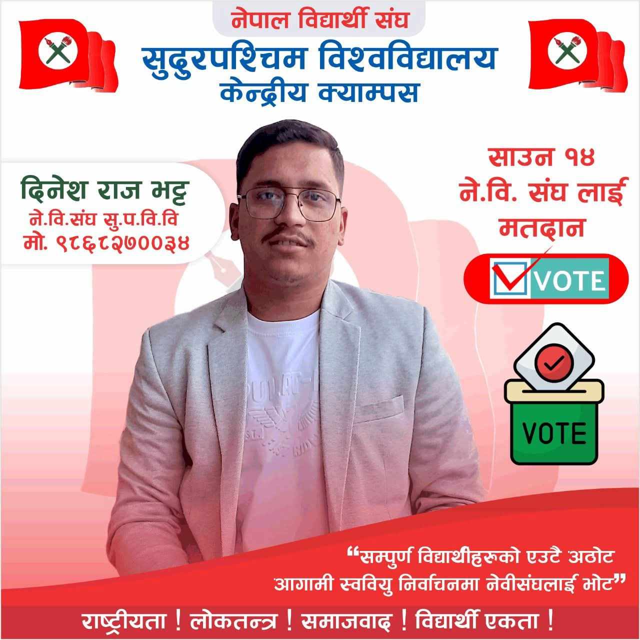 उनले नेवि संघले ताला लगायो, खोल्यो भन्दै दुस्पचारमा उत्रिएको बताउँदै त्यो विषयमा सत्यता नभएको र नेवि संघ एक ढिक्का भएर चुनावी मैदानमा होमिएको बताए । ‘केही व्यक्ति, संघ संगठनको आन्दारित समस्या नेवि संघमा देखाएर चुनाव भाँड्न भाईदैन, हामी चुनावकै पक्षमा किन्त परन्तु होईन एनि हाउ ईलेक्सन नेवि संघको बटम लाईन हो ।’ उनले चुनाव गराउनकै लागि नेवि संघबाट खटिएका केन्द्रीय सदस्य तेज ऐरले पहिल्यैदेखि पाटी, संगठन, निर्वाचन समिति, सुप विश्वविद्यालयका पदाधिकारी छलफल जारी गरेर चुनावको पक्षमा लभिङ्गमा जुटेको बताए । ‘नेवि संघ एक स्वरका साथ चुनावको पक्षमा छ, चुनावमा नेवि संघको कुनै अवरोध छैन, ‘उनले भने, ‘नेवि संघका नाममा चुनाव भाँडन आउनेमाथि प्रहरी, प्रशासन, निर्वाचन समिति, विश्वविद्यालयले कार्बाही गरोस, चुनाव भाँड्ने नेवि संघ मात्रै होईन विद्यार्थीको पनि नेता हुन सक्दैन ।’ नेवि संघबाट सभापतिका उम्मेदवार भट्टले चुनाव गराउनका लागि निर्वाचन समिति, क्याम्पस प्रशासनदेखिका निकायसंग आग्रह गरेका छन ।