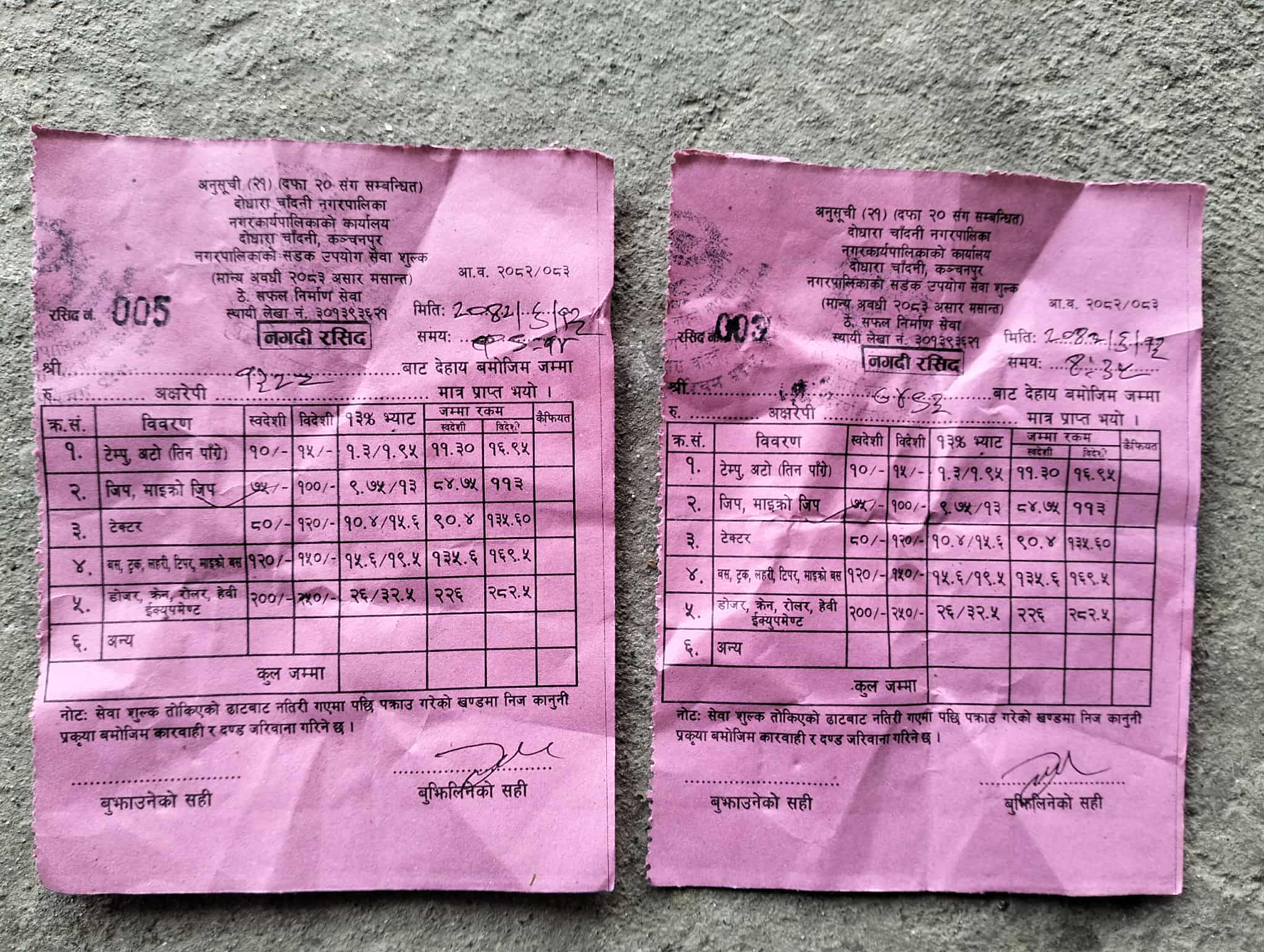 चालु आर्थिक बर्ष ०८२÷०८३मा नगरपालिकाले आब्हान गरेको ठेक्का अनुरुप सफल निर्मा्रण सेवाले सडक उपभोग सेवा शुल्क उठाउने जिम्मा पाएको थियो । तर, कम्पनीले सम्झौता बिनै धमाधम ठेली काटेको भन्दै स्थानीय बिरोधमा उत्रिएका छन । स्थानीय हरिस सिह साउदले नगरपालिकासंग सम्झौना बिनै धमाधम ठेली काटेको भन्दै स्थानीयले बिरोध गरेको बताए । अवैध रुपमा ५ठेली कोटेको भन्दै स्थानीयले रोक्न माग अघि सारेका छन । दोधाराचाँदनी नगरका प्रमुख प्रशासकीय अधिकृत गणेश राज मिश्रले सम्झौता बिनै ठेली काटेको भए ठेली जफत गरेर प्रहरीलाई बुझाउनुपर्ने बताए । मेयर किशोर कुमार लिम्बुले सम्झौताको विषयमा जानकारी नभएको बताए ।