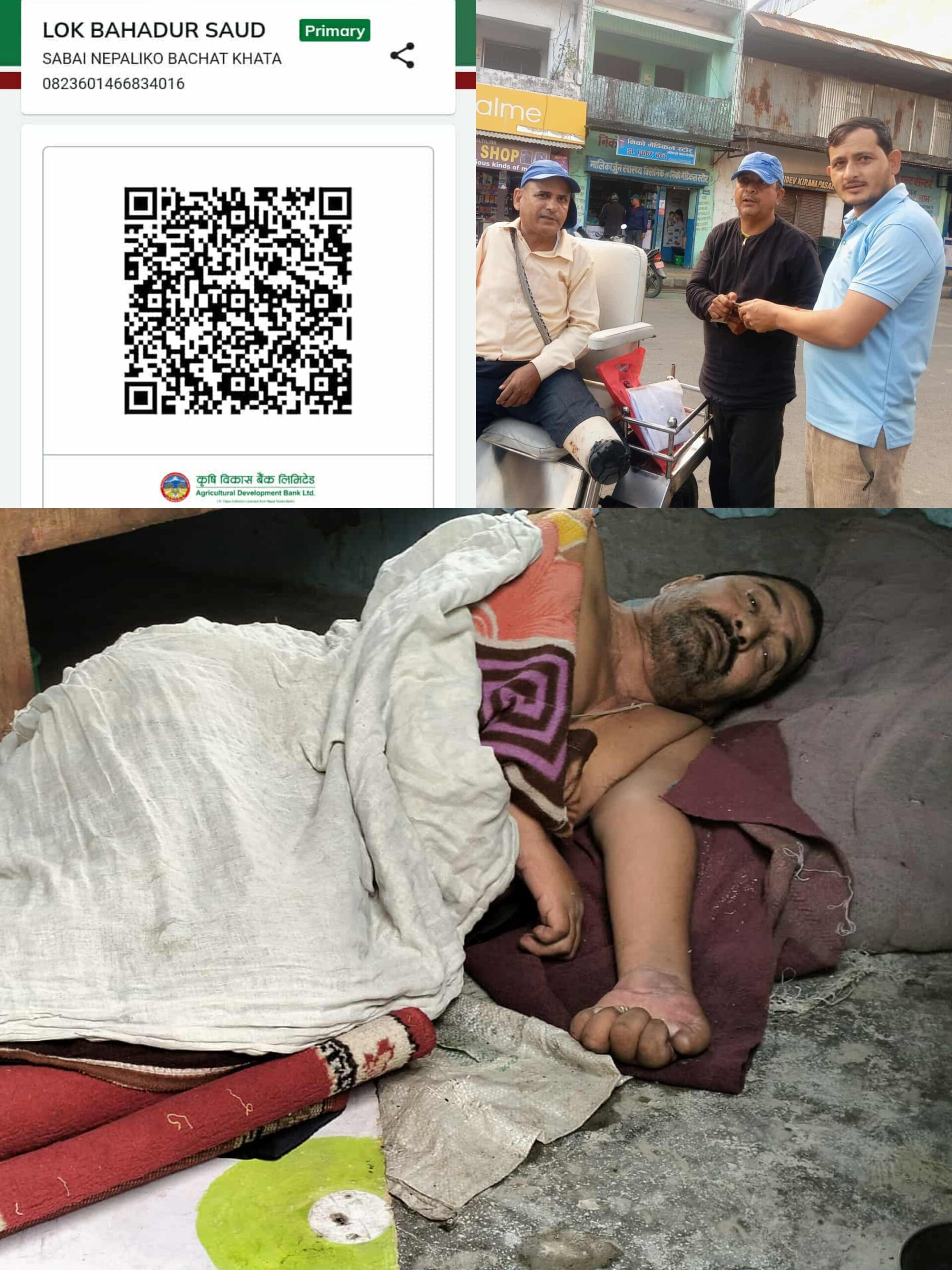 ‘तिहार अघि दाजु एक्कासी बिरामी भएपछि हामीले जेनतेन जसोतसो गरेर नजिकैको रहेको महाकाली अस्पतालमा लग्यौँ, ‘उनले भने, ‘दाजुले त्यहाँ बेडमै दिशापिसाब गर्न थालेपछि त्यहाँका नर्स र डाक्टर पनि हैरान भएर कि ठुलो अस्पताल उपचार गर्न लैजाउ कि घर लैजाउ भनेर कर गर्न थालेपछि हामीले बिरामी निको नहुँदै घर ल्याएका हौँ, घरमा बिरामीलाई राम्रोसंग सुत्न आराम गर्न खाट पनि छैन, बेडबिस्तारा पोषिलो खानेकुरा पनि छैन ।’ एकल पुरुष समेत रहेका करनले ह्वीलचियरमै बसेर समान्य व्यवसाय गर्दै आएका थिए । साउद परिवारले उपचारका र छाक टार्नका लागि आवश्यक सहयोगको अपिल समेत गरेका छन । महाकाली अस्पतालका निमित्त मेसु डा. अर्जुन कुमार भट्टले पिसाबमा खराबी देखिएकाले उपचार गरेर घर पठाएको बताए । ‘उहाँ करन साउद जीको हाम्रो स्रोत साधनले भ्याएसम्म गरेर हामीले उप उपचारका लागि हायर सेन्टरमा डिस्चार्ज गरेर पठाएका छौँ, ‘उनले भने, ‘यहाँबाट रोग निको नहुँदै थप रोग पत्ता लगाउन पठाएका हौँ ।’ साउद परिवारले उपचारका लागि सक्दो आर्थिक सहयोग गर्न अपिल गरेका छन ।