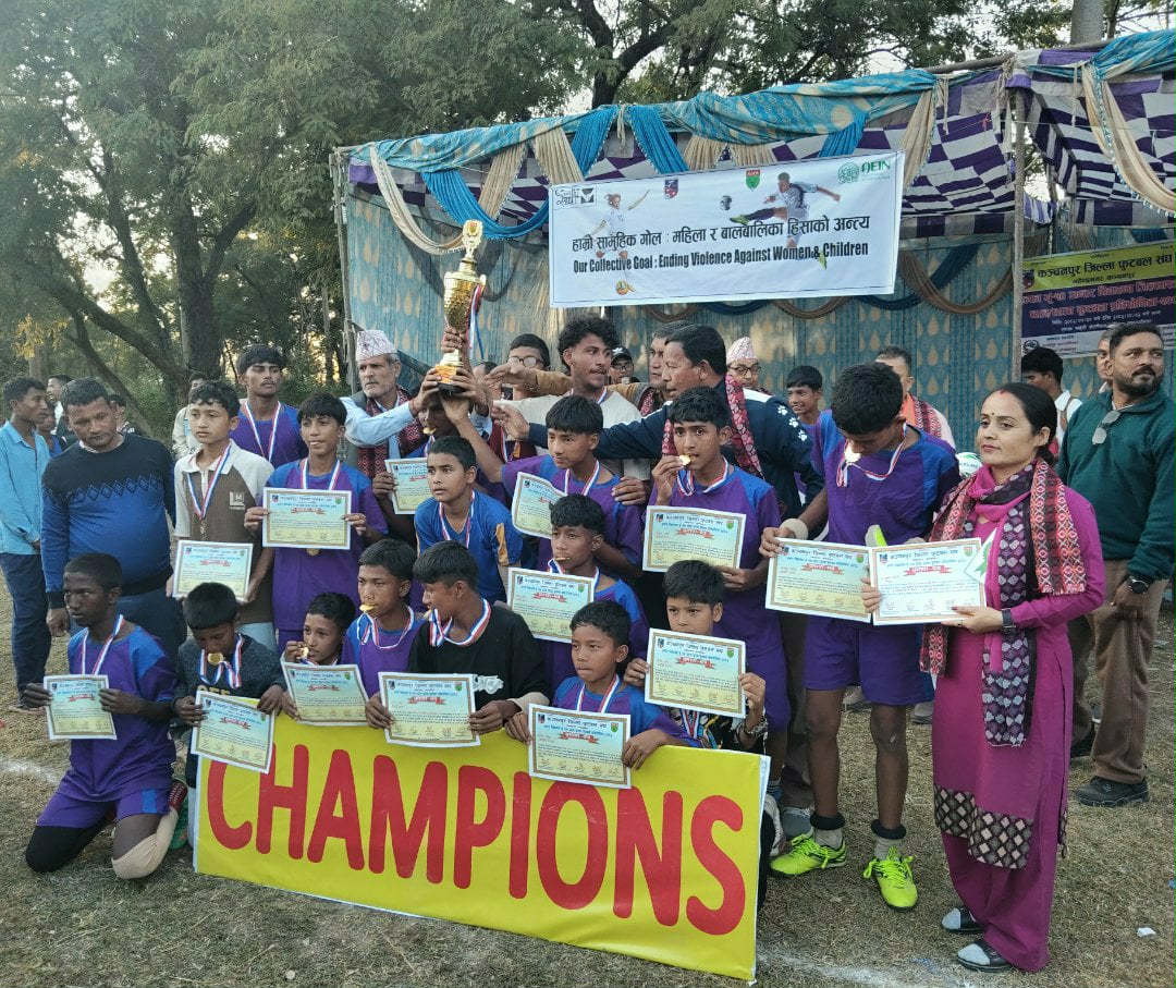 अखिल नेपाल फुटबल संघ (एन्फा) को वार्षिक कार्यक्रम अनुसार कञ्चनपुर जिल्ला फुटबल संघ कञ्चनपुरको आयोजनामा मछेली खेलमैदान सञ्चालन भएको एन्फा यू–१४ अन्तर विद्यालय स्तरीय छात्रा÷ छात्र फुटबल प्रतियोगितामा सरस्वती माविले लिगदेखि क्वाटर फाईनल प्रवेस गरेकोे जनाएको छ । १४ बर्षमुनी उमेर समुहका विद्यार्थीविच भएको प्रतियोगितामा बेलडाँडीबाट फाईनलमा सरस्वती मावि झर्नासागरको टिम छनौट भएसंगै विद्यार्थी, शिक्षक, अभिभावक एव जनप्रतिनिधीले क्वाटरफाईनल प्रतियोगिताका लागि अग्रीम सुभकामना दिएका छन ।