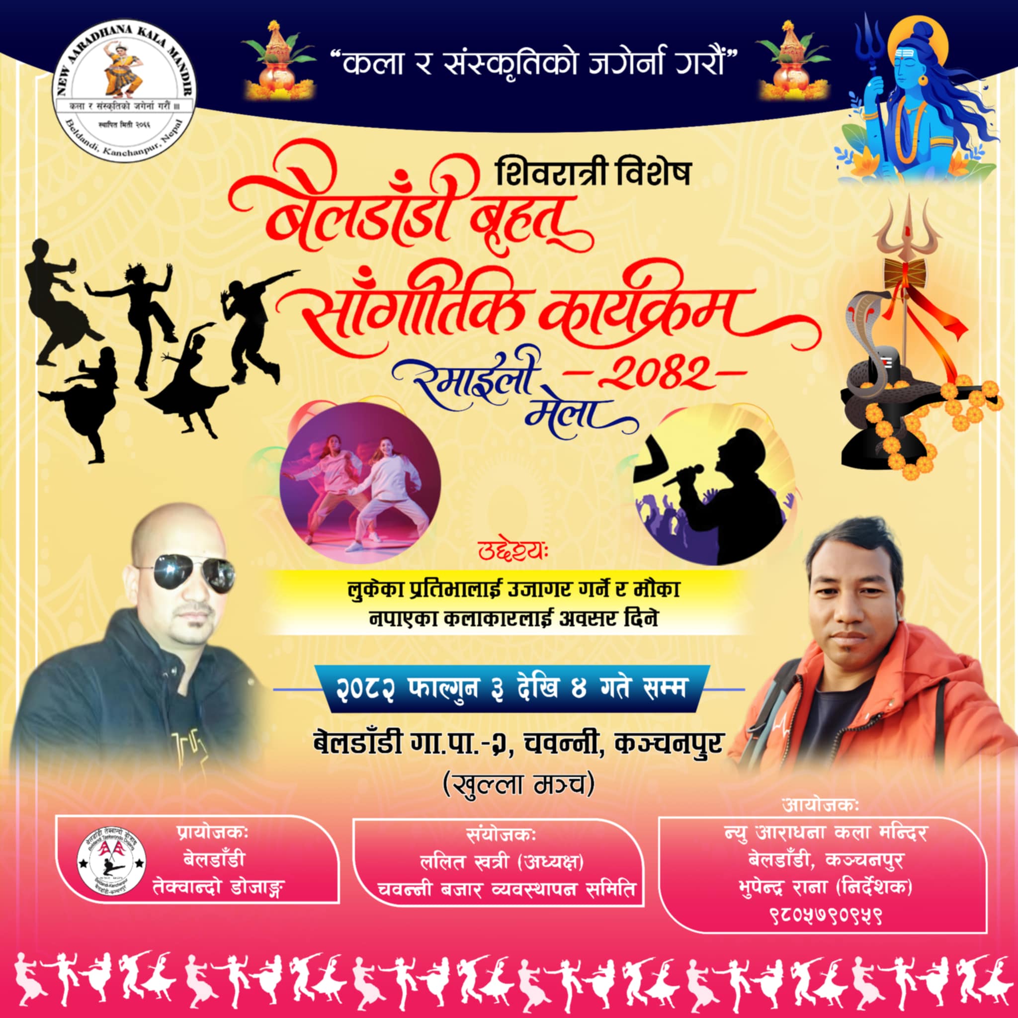 बेलडाँडी । कञ्चनपुरको बेलडाँडी गाउँपालिकामा कला र संस्कृतिको संरक्षण तथा प्रवद्र्धन गर्ने उद्देश्यका साथ “बेलडाँडी बृहत् शिवरात्री विशेष सांगीतिक कार्यक्रम रमाईलो–२०८२ मेला” आयोजना हुने भएको छ ।