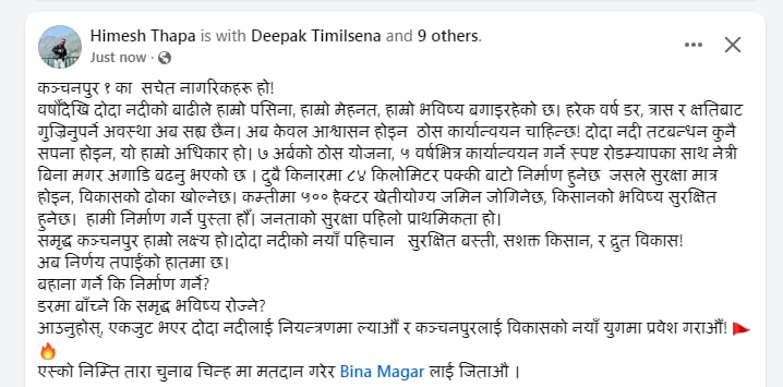थापाले क्षेत्रका जनतासंग स्वष्ट मिसन, भिजन, काम गर्ने क्षमता भएकी नेतृ बीना मगर जिताउन अपिल गरेका हुन । थापाले बिना मगर जिताउन यस्तो अपिल गरेका छन । कञ्चनपुर १ का सचेत नागरिकहरू हो ! , वर्षौँदेखि दोदा नदीको बाढीले हाम्रो पसिना, हाम्रो मेहनत, हाम्रो भविष्य बगाइरहेको छ। हरेक वर्ष डर, त्रास र क्षतिबाट गुज्रिनुपर्ने अवस्था अब सह्य छैन। अब केवल आश्वासन होइन ठोस कार्यान्वयन चाहिन्छ! दोदा नदी तटबन्धन कुनै सपना होइन, यो हाम्रो अधिकार हो। ७ अर्बको ठोस योजना, ५ वर्षभित्र कार्यान्वयन गर्ने स्पष्ट रोडम्यापका साथ नेत्री बिना मगर अगाडि बढनु भएको छ । दुबै किनारमा ८४ किलोमिटर पक्की बाटो निर्माण हुनेछ जसले सुरक्षा मात्र होइन, विकासको ढोका खोल्नेछ। कम्तीमा ५०० हेक्टर खेतीयोग्य जमिन जोगिनेछ, किसानको भविष्य सुरक्षित हुनेछ। हामी निर्माण गर्ने पुस्ता हौँ। जनताको सुरक्षा पहिलो प्राथमिकता हो।