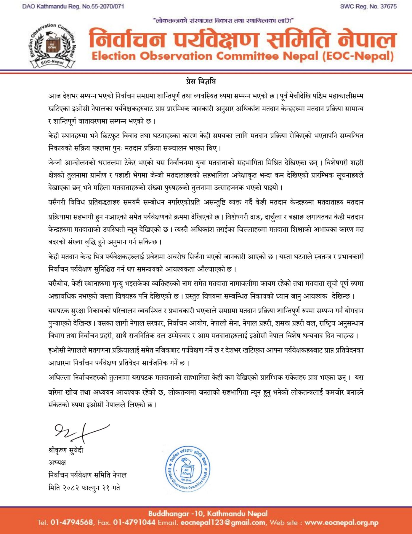 समितिले जारी गरेको प्रेस विज्ञप्तिअनुसार पूर्व मेचीदेखि पश्चिम महाकालीसम्म खटिएका पर्यवेक्षकहरूबाट प्राप्त प्रारम्भिक जानकारीका आधारमा अधिकांश मतदान केन्द्रहरूमा मतदान प्रक्रिया सामान्य र शान्तिपूर्ण वातावरणमा सम्पन्न भएको उल्लेख गरिएको छ।