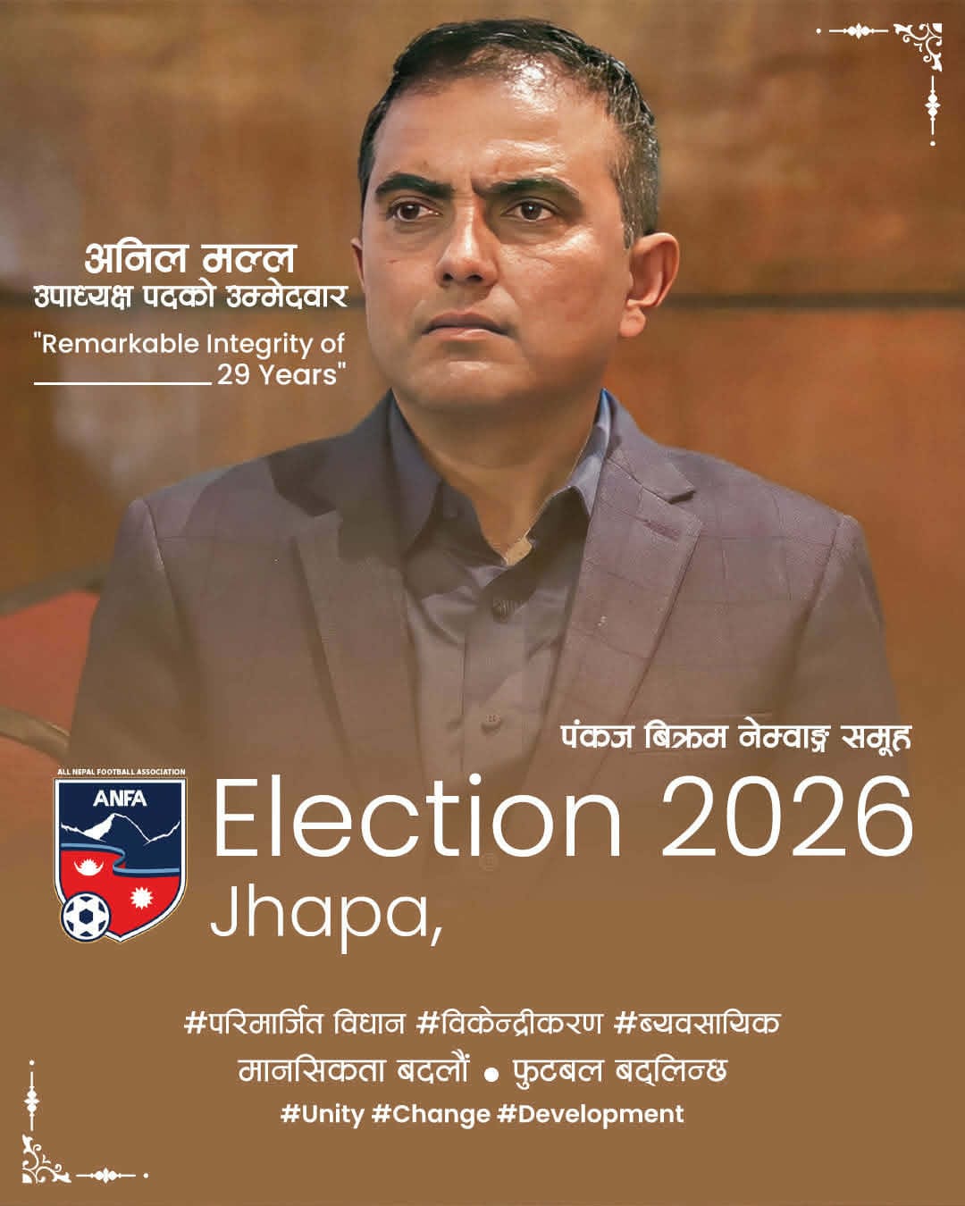 उनले एन्फाको वर्तमान संरचनामा केन्द्रीकरण हुँदा निर्णय प्रक्रियामा पारदर्शिता र समान सहभागिता अभाव रहेको औंल्याउँदै, विधान संशोधनमार्फत विकेन्द्रीकृत प्रणाली निर्माण गर्नुपर्ने आवश्यकता औँल्याए। उनका अनुसार यसले न केवल एन्फाको सञ्चालनलाई अधिक लोकतान्त्रिक बनाउनेछ, तर मोफसलका संघ र क्लबहरूको योगदानलाई पनि सम्मान दिनेछ।