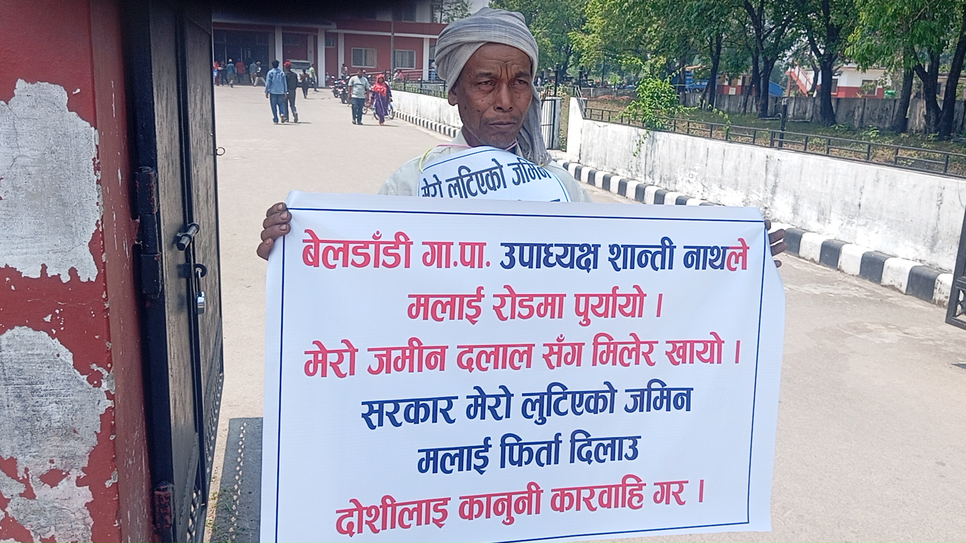 बिहीबार राना जिल्ला प्रशासन कार्यालय कञ्चनपुरको मुल गेटमा धर्ना दिदै पुगेका थिए । उनले ल्याएको ब्यानरमा ‘बेलडाँडी गाँउपालिका उपाध्यक्ष शान्ति नाथले मलाई रोडमा पु¥यायो, मेरो जमिन दलालसंग मिलेर खायो, सरकार मेरो लुटिएको जमिन मलाई फिर्ता दिलाउ, दोषीलाई कानुनी कार्बाही गर’ भन्दै हारगुहारमा उत्रिएका थिए ।